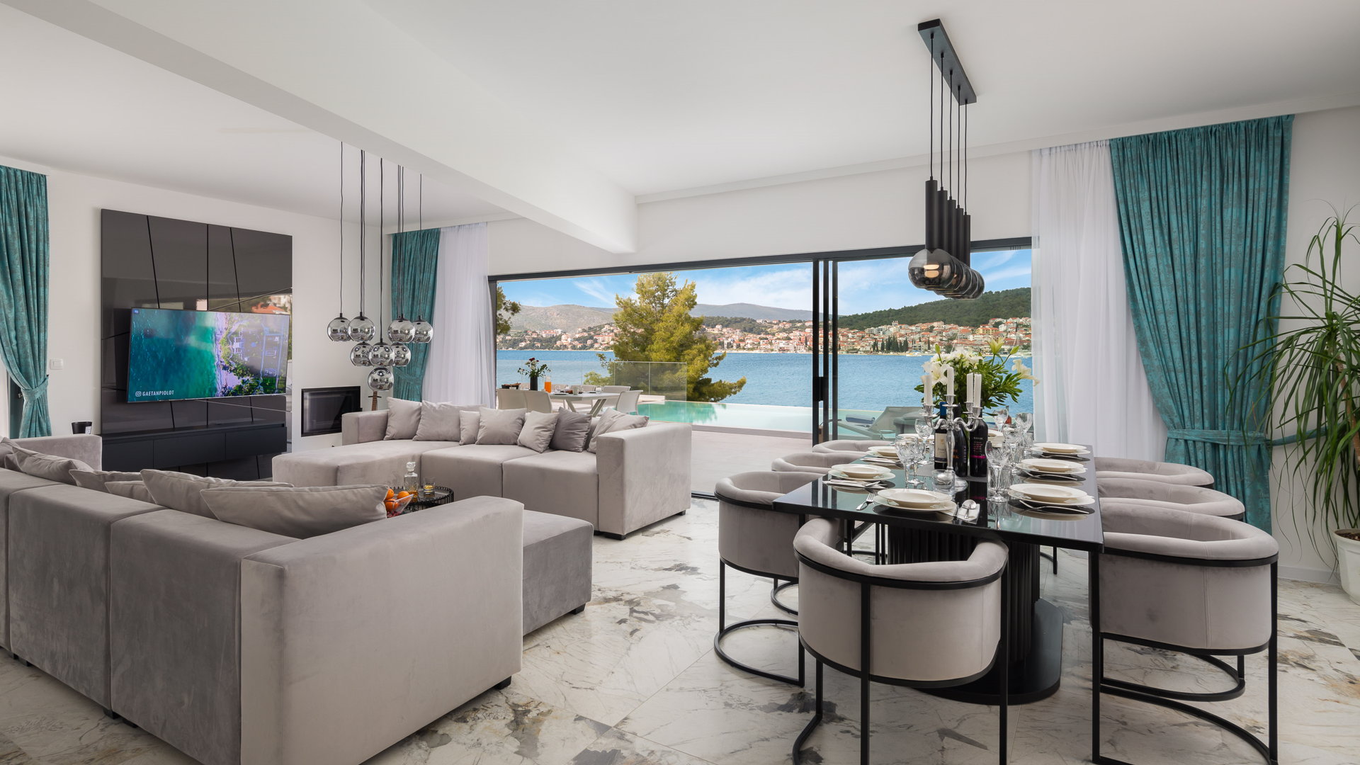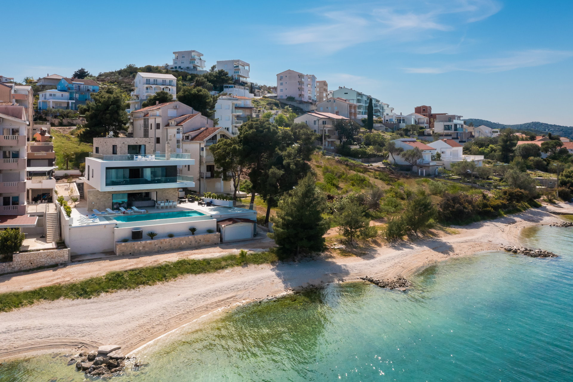 Vila Milka s bazenom nalazi se u Okrugu Gornjem u blizini Trogira, prekrasnom mediteranskom gradu na jadranskoj obali. Ono što vas na početku može obradovati je sam položaj vile, koja se nalazi na samoj obali, s plažom ispred.